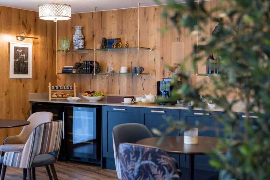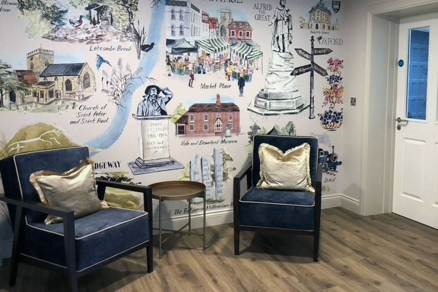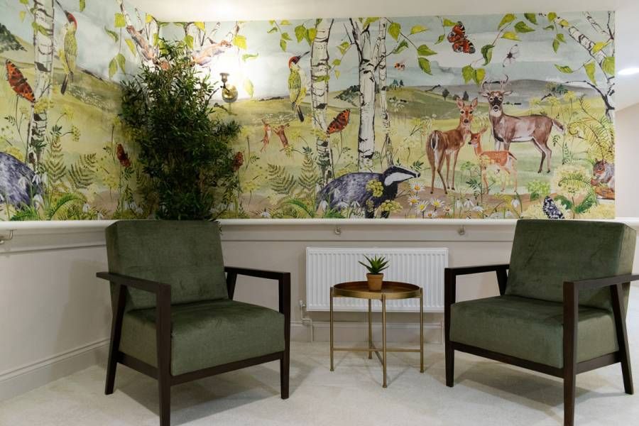 We designed the hallways and corridors to feel uplifting rather than simply functional. Bespoke mural wallpapers, commissioned from an Oxfordshire artist, feature gentle depictions of local flora and fauna. These artworks give each floor its own identity, help residents find their way around easily, and contribute to a calm atmosphere for residents and visitors alike.