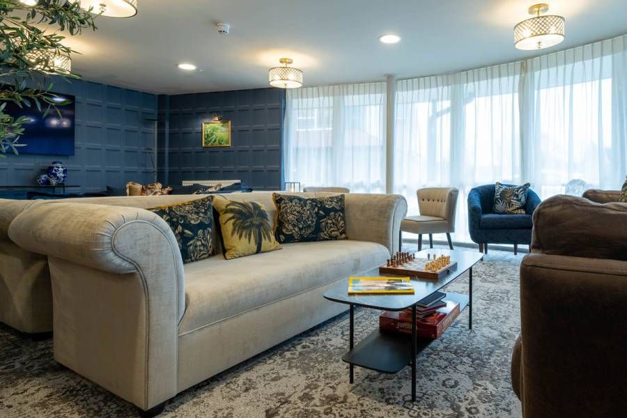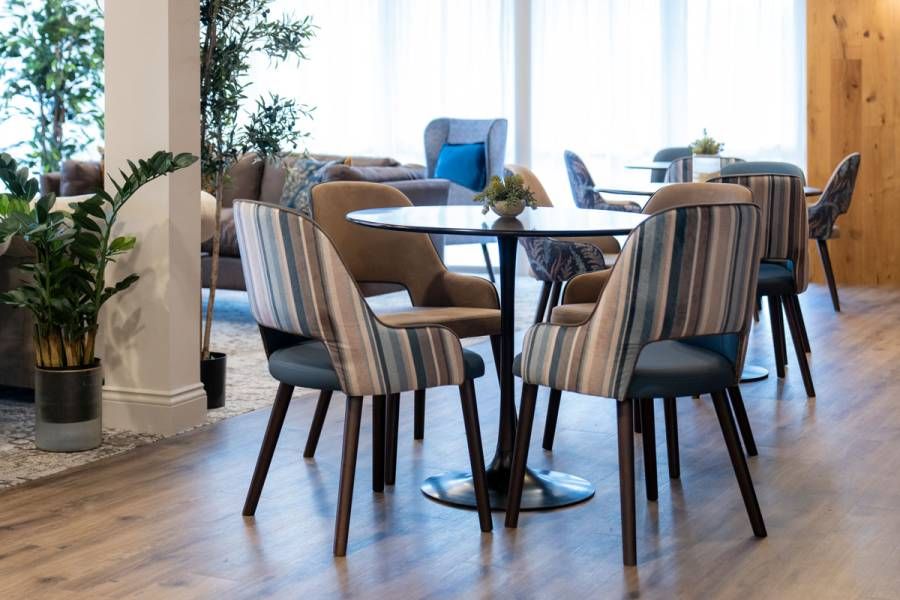 Flippa Interiors designed the communal areas, manager’s office and connecting hallways within this luxury retirement living development in Oxfordshire, creating warm, sociable interiors that support wellbeing, comfort and independent living. From the residents’ club lounge to bespoke mural-lined corridors, every space was planned to feel welcoming, practical and easy to use.