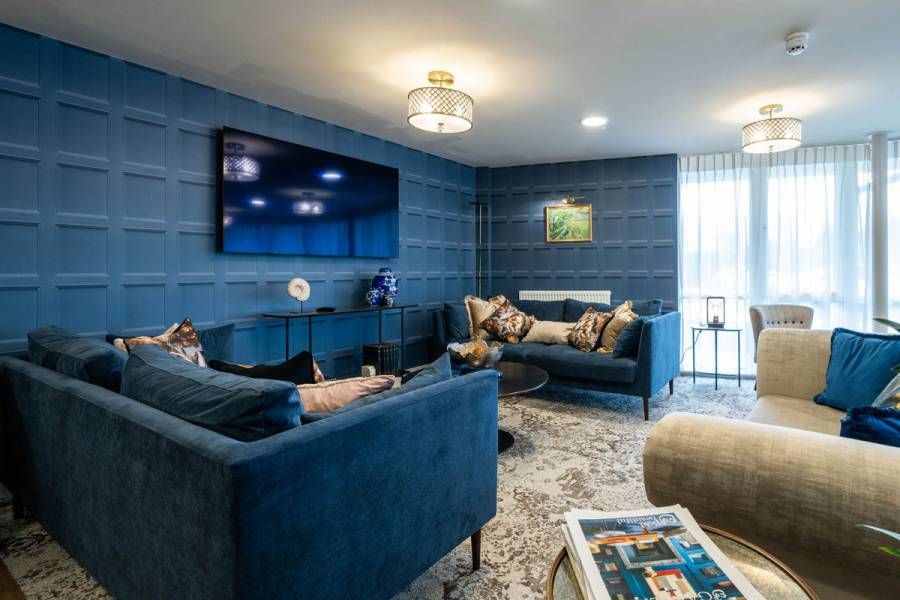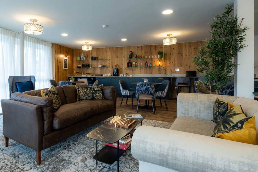 Working from the early planning stages, we shaped the residents’ club lounge as the social heart of the development. A mix of armchairs, sofas and flexible seating allows the room to adapt throughout the day, from quiet coffee mornings to larger social gatherings. Warm timber finishes and layered lighting introduce a sense of homely comfort, while an integrated media wall enables the space to function equally well for film nights, talks and community events.