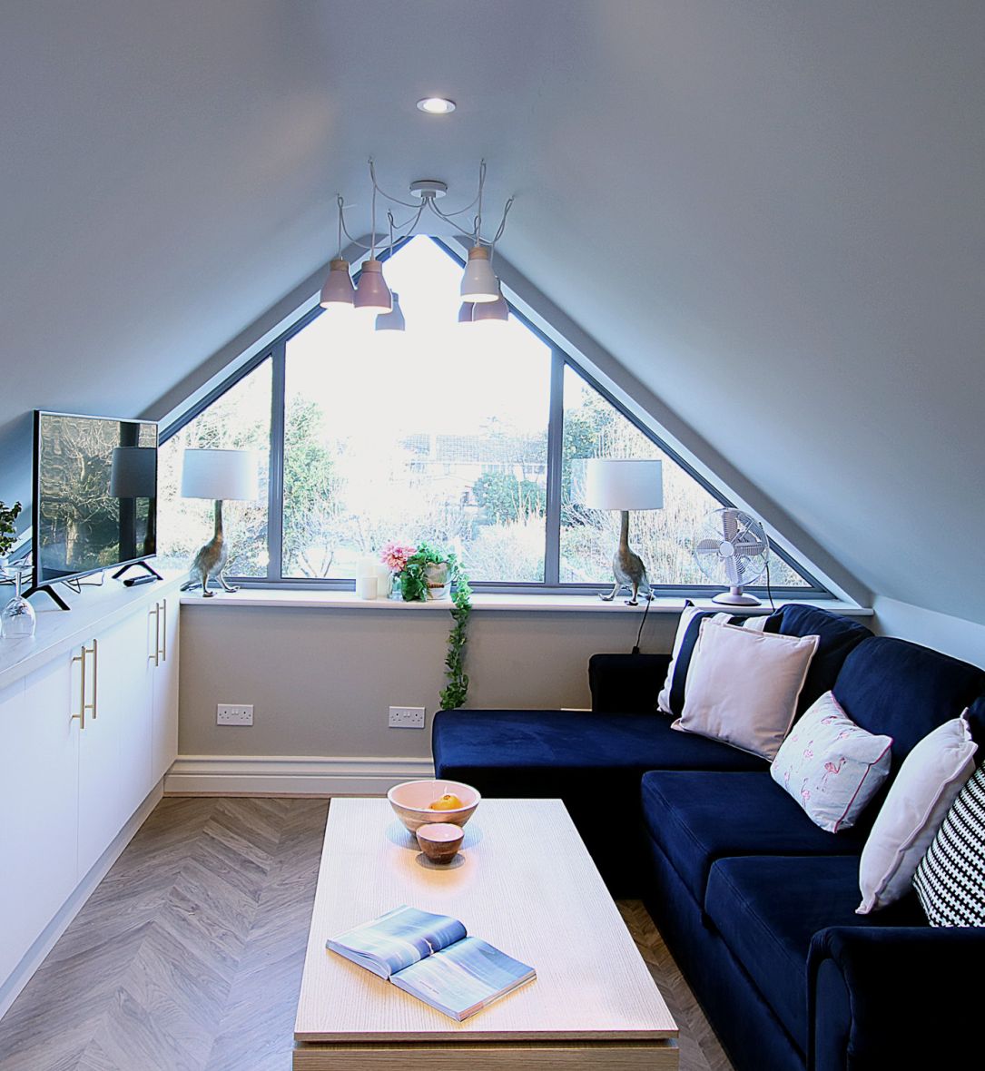 Brilliant design features work hard in this apartment: wardrobes built into eaves, a lift up coffee table that doubles as a dining area whilst providing hidden storage, an open shelved dressing table. Other discreet design elements have been incorporated to give the bijou sized apartment character without over powering, for example the pink grout and copper details in the shower room.