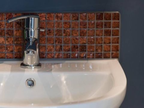 The star of the show, however, is the splashback above the new sink. A mosaic of gleaming copper tiles catches the light beautifully, creating a warm, shimmering contrast against the cool blue walls. This choice was twofold: it links back to the copper details in the bedroom, creating a cohesive design language throughout the suite, and it adds a powerful touch of luxury and individuality. It’s a prime example of how a small area of a high-impact material can elevate an entire room.