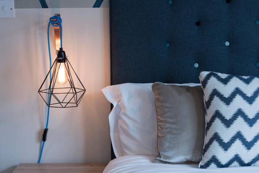 We created a calm, neutral backdrop for the bedroom, allowing key design details to stand out. One of the most distinctive features is the lighting. We sourced on-trend, retro-inspired cage lamps, which not only add an industrial-chic character but also prove that high style doesn't always require a high budget. Suspending a feature light from a bespoke copper wall bracket creates a unique focal point beside the bed, freeing up space on the bedside table and adding a touch of bespoke design. This detail, a simple combination of metal and light, perfectly captures the room’s blend of period character and modern sensibility.